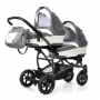 Люльки устанавливаются на шасси друг за другом на разных уровнях. Это обеспечивает малую ширину шасси и возможность проехать в любую дверь. Материалом для изготовления шасси послужил прочный и легкий алюминиевый сплав. Пружинная система амортизации и надувные каучуковые колеса обеспечивают коляске плавный ход и снижают уровень тряски. Передние колеса поворотные, с возможностью фиксации в положении «прямо». Высота родительской ручки настраивается под любой рост. Для покупок и игрушек имеется вместительный багажник.