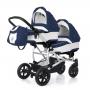 Люльки устанавливаются на шасси друг за другом на разных уровнях. Это обеспечивает малую ширину шасси и возможность проехать в любую дверь. Материалом для изготовления шасси послужил прочный и легкий алюминиевый сплав. Пружинная система амортизации и надувные каучуковые колеса обеспечивают коляске плавный ход и снижают уровень тряски. Передние колеса поворотные, с возможностью фиксации в положении «прямо». Высота родительской ручки настраивается под любой рост. Для покупок и игрушек имеется вместительный багажник.